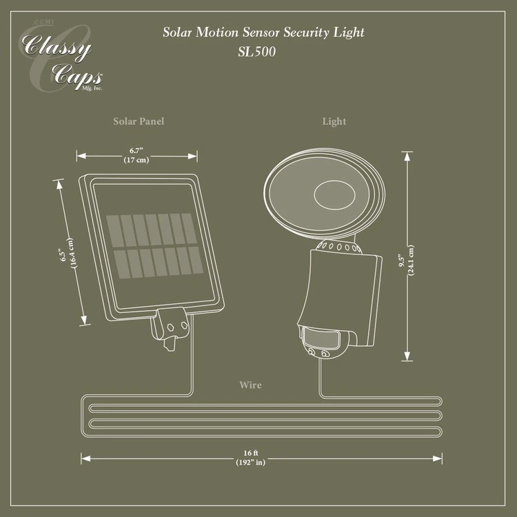 Classy Caps Solar Motion Sensor Security Light – Black protects buildings, homes, and cottages with the motion sensor security light. Potential intruders are discouraged by an automatic brilliant white light that is triggered by an infrared motion detector. Our unique solar-powered design eliminates the use of electricity. Installation is quick and easy with the mounting hardware provided.