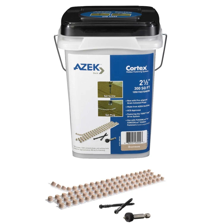 Collated Cortex for TimberTech Azek Decking – 300 SF – 2-1/2″ is a fast and easy way to conceal fasteners and screw heads when installing decking boards. Installation is fast and easy using the collated cortex strips. No need to worry about dropping the plugs. Compatible with TimberTech AZEK Harvest, Landmark and Vintage Collections. The package includes everything needed, including screws, plugs and setting tools. FastenMaster recommends installing with an 18 volt cordless drill with 1/2″ chuck or a corded drill with 1/2″ chuck.