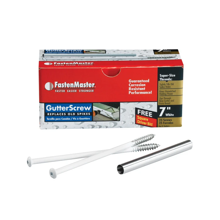 FastenMaster GutterScrew enables you to replace old popping gutter spikes once and for all. The super-sized thread diameter is wider than gutter spikes to tightly fill old worn spike holes for better holding strength and a watertight fit. The durable, UV-resistant Brown and White paint matches most gutter systems, while the thick, galvanized base coating is guaranteed to not rust or react with aluminum. The 7″ length is compatible with standard 5″ residential gutter systems.