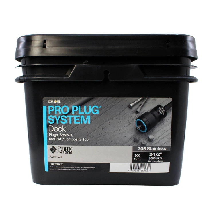 The Pro Plug System for Endeck Decking – 300 Square Feet is a superior and easy-to-install plug fastening system for Endeck Decking. With the epoxy coated or stainless steel fasteners, it gives builders the ability to choose the right screw for a wide variety of applications.